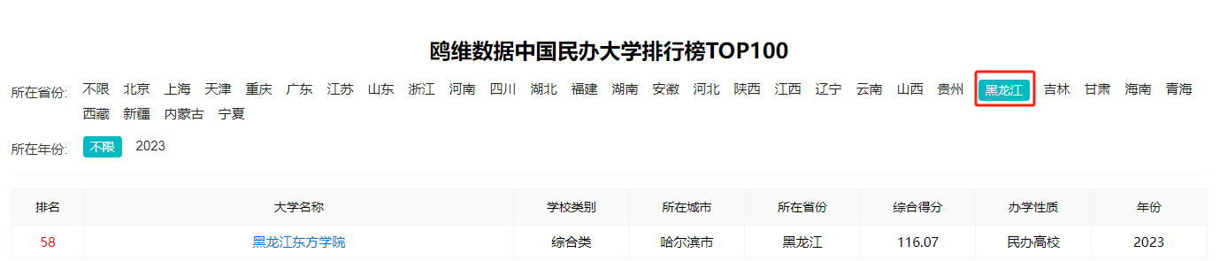 根据“鸥维数据中国民办大学排行榜TOP100”排名,黑龙江东方学院在全国综合类民办高校中位列第58名,也是黑龙江省民办高校中唯一上榜的学校 。