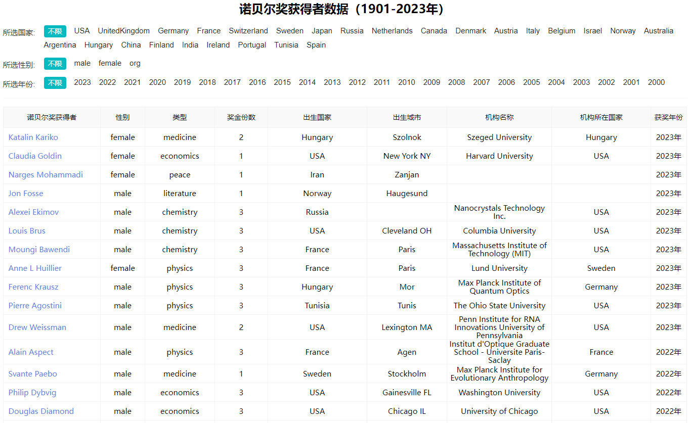 有鉴于此,近日鸥维数据(www.ovo.com.cn)收录整理了“诺贝尔奖获得者数据”,据统计,从1901年到2022年,诺贝尔奖共颁发615次,共有954人和27个组织获奖。其中物理学奖116次、化学奖114次、生理学或医学奖113次、文学奖115次、和平奖103次以及经济奖54次。