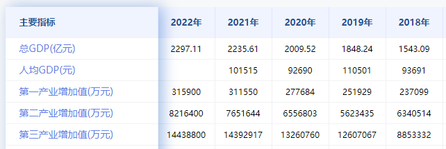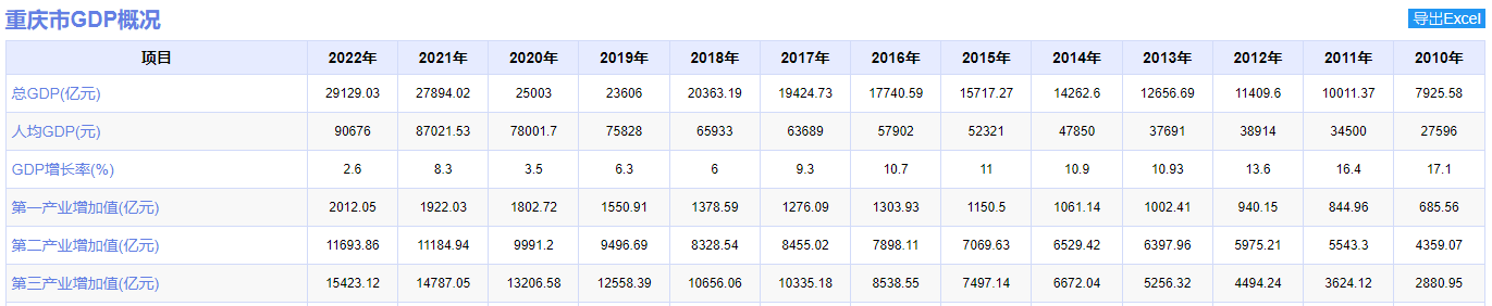 根据鸥维数据(www.ovo.com.cn)整理信息显示,做为重庆两大万亿级产业的重要承载地,渝北区2022年经济总量仍居全市第一位,全年实现地区生产总值2297.11亿元。虽是重庆唯一跨入2000亿元俱乐部的超级成员,但也掩盖不了其经济的一再下沉。2022年GDP实现0.9%的增速,排列全市倒三位。