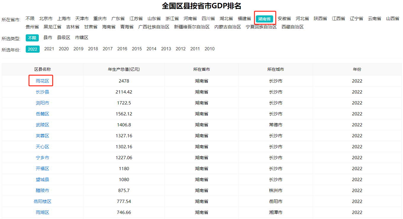 根据鸥维数据(www.ovo.com.cn)平台整理发布的湖南经济强县榜显示,2022年,雨花区(2478亿元)、长沙县(2114.42亿元)、浏阳市(1722.5亿元)、岳麓区(1562.12亿元)、武陵区(1406.8亿元)、芙蓉区(1327.16亿元)、天心区(1302.16亿元)、宁乡市(1227.06亿元)、开福区(1180亿元)和望城县(1080亿元)成为湖南经济的十强县。