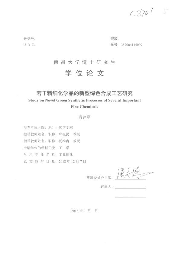 With the reckless consumption of fossil resources and energy, the ecological en-vironment is rapidly deteriorating, and humans are facing the most serious resource and environmental crisis ever. To develop green chemistry is the inevitable choice for human existence and social sustainable development. It is very important and mean-ingful for vigorously promoting green chemistry in the fine-chemical industry. Sever-al important fine chemicals for fields of medicine and coatings were synthesized from the point of view of green chemistry. On the one hand, the process parameters for the preparation of 5-methylfurfural from fructose in solution of H₃PO₃/I⁻ acid aqueous/ toluene were optimized with us-ing cheap H3PO3 as co-reductant. The highest 5-methylfurfural molar yield was 79.6% under better reaction conditions. The recycle of the aqueous phase was inves-tigated. Furthermore, the yields of 5-methylfurfural from bio-based glucose, inulin, sucrose, and cellulose in the reaction system were examined, and got satisfactory re-sults. Activated carbon supported palladium catalyst was prepared through coating activated carbon with colloidal palladium stabilized by polyvinylpyrrolidone before carbonization. The loading of palladium on activated carbon was 4.86%, and the size of Pd particles is small and uniform (3~5 nm). The synthesized catalyst was found to be highly effective to the direct re-ductive amination of 5-methylfurfural with aniline, and catalyst can be reused at least four times without significant loss of catalytic activity. The synthesis of N-(5-methylfurfuryl)aniline was a consecutive reaction including dehydration condensation reaction and catalytic hydrogenation reaction. N-(5-methylfurfuryl)aniline molar yield was over 99% under better pressurized conditions. Besides, the scope of the substrate amines was examined, and most of them showed very good results. The toluene solution of fruc-tose-derived 5-methylfurfural from the top organic layer of the reaction system of fructose to 5-methylfurfural was used as raw material for pressurized reductive amination with aniline after simple purification. Thus, with this two-step approach, renewable N-(5-methylfurfuryl)aniline was produced from fructose. We deduced the plausible reaction pathway for production of 5-methylfurfural from fructose and the collaborative mechanism of solution of H₃PO₃/I⁻ acid aqueous/ toluene. And the reaction mechanism of direct reductive amination of 5-methylfurfural catalyzed by activated carbon supported palladium was also discussed. On the other hand, we provided a solvent-free method to modify allyl methacry-late (AMA) with 1,1,1,3,5,5,5-heptamethyltrisiloxane (MD〓M) through atomic eco-nomic hydrosilylation reaction catalyzed by Speier's catalyst. We also studied the ap-plication of MD〓M modified AMA in waterborne self-matting styrene-acrylic emul-sions. It turned out that MD〓M modified AMA contains unsaturated isopropenyl cat-alyzed synthesized by catalyst and using 2,6-di-tert-butyl-4-methylphenol as polymerization inhibitor without any other solvent. The conversion of MD〓M and AMA reach 88% and 92% respectively under optimized conditions. As for the formulas used in this paper, the surface gloss of emulsion coating film with MD〓M modified AMA comparatively decreased 71% with that without modified AMA and considered as semi-gloss, and the water contact angle of film with MD〓M modified AMA increased 63% compared with blank controller. These results were associated with the structure of the silicone chain segments exposing to the air-film interface. Key Words: fine chemical; green synthesis; 5-methylfurfural; N-(5-methylfurfu-ryl)aniline; waterborne self-matting styrene-acrylic emulsion
