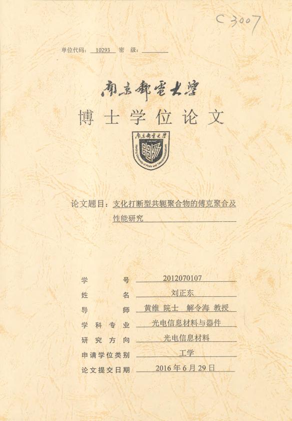 Developing simple, efficient, convenient and atom-economical methods to synthesize optoelectronic functional polymer semiconductors with novel structures and desired performances is of great important for the development of theoretical research and industrial in the field of organic electronics. At the beginning of our studies, we proposed the design and synthesis of polymer semiconductors through Friedel-Crafts polymerization of fluorenyl tertiary alcohols. Kinds of branched interrupted conjugation polymers (BICPs) were prepared. Then, combine with the pnenergy band theory and Friedel-Crafts polymerization, p-n type BICPs were prepared. Through the Friedel-Crafts postfunctional polymerization, the end groups of BICPs were hindered functional with other groups. Tunable energy gaps of BICPs with stable spectral and electrochemical were obtained. At last, the optoelectronic properties of these polymers were systemically studied. These charge storage properties were studied by using these polymers in transistor memories as the polymer electret layers. On the other hand, graphene were growth on copper-nickel alloy nanofibers by chemical vapor deposition (CVD) and patterned reduced graphene oxide (rGO) conductive films were prepared through high temperature reduction method, respectively. After that, all-solution processable organic memory device was prepared by using patterned rGO as the top and bottom electrodes, hindered functionalized polymer as the active layers. The details of the dissertation are as follows: 1.The design and synthesis of polymer semiconductors were introduced briefly, especially the synthesis of organic semiconductor materials by the Friedel-Crafts reaction of fluorenyl tertiary alcohols and the three-dimensional branched conjugated polymers and their application in optoelectronic devices. Then, an overview of the research progress of polymer electrets in the organic field effect transistor memories and flexible organic memory devices were presented. Finally, the design ideas and main studies of this dissertation were put forward. 2.Based on the research foundation of our group in the synthesis of organic semiconductor materials through BF〓Et?O catalyzed Friedel-Crafts reaction of fluorenyl tertiary alcohols, we proposed the Friedel-Crafts polymerization of AB〓 (x≥2) tertiary alcohols for the synthesis of BICPs. The new polymerization method exhibits the characterization of simple, efficient, atom-economical, and non-metal catalyst. After careful study the polymerization conditions, it is found that the polymerization process was finished in a very short time (<5min). Polymers with molecular weight (Mn) of 22700 g/mol and narrow polydispersity index (PDI=1.52) were obtained through slow monomer addition polymerization. After that, a novel series of fluorene and cyclopentadithiophene based BICPs were prepared and these optoelectronic properties were studied. The cyclopentadithiophene based BICPs exhibit near infrared absorption spectra. 3.p-n type fluorenyl tertiary alcohols containing electron donating group, i.e., carbazole or thiophene (p-type group) and electron-withdrawing group, i.e., cyano (n-type group) were designed and synthesized according to the p-n energy band theory, p-n type BICPs were prepared through Friedel-Crafts polymerization. Spectral characterization revealed that the absorption and emission peaks exhibit red-shift in comparison with the BICPs which do not contain cyano groups. The emission peaks in thin film state indicated that the introduction of cyano groups not only suppress the green emission peaks but also reduces the bandgaps of these polymers, which is good for the carrier injection. 4.The HICP, i.e., PCzPF, with carbazole as the end functional groups was hindered functional with 9-phenyl-9H-fluorene (PF) or 9,9,9",9"-tetraoctyl-9'-phenyl-9H,9'H,9"H-2,2':7',2"-terfluorene(TF) through BF〓·Et?O catalyzed Friedel-Crafts postfunctional polymerization. We found that the introduction of functional groups improve the spectral and electrochemical stability. Impressively, postfunctional with PF groups increased the HOMO energy level and decreased the LUMO energy level, which regulate the energy gaps of the polymer effectively. 5.In order to study the relationship between the functional groups and the charge storage properties of CIHPs. CIHPs, including PCzPPF, PCzPF, PCNCzPF and PCPDT8, were used as the polymer electret layers in transistor memories. The programming progress was conducted by applied a negative pulse on these transistor memories. Erasing process was realized by light irradiation these devices. Interestingly, all of these transistor memories exhibit stepwise negative shifts of transfer curves with the increase of the negative gate bias. In this case, PCPDT8 containing high electron density cyclopentadithiophene group and p-n type PCNCzPF based transistor memories, exhibited larger memory windows than others, which are 34.2 and 45.0 V, respectively. The positive shift of the transfer curve was occurred when a positive gate voltage was applied and combined with light irradiation, indicating the injection of electron into the electret. After applying a negative pulse, the transfer curves return to the initial state. In this case, PCzPPF and PCzPF based transistor memories exhibited large memory windows of 42.7 and 40.5 V, separately, which are higher than PCNCzPF and PCPDT8 based devices. Since these devices could be injected hole into the electret layer by applying negative pulse and electron by applying positive gate voltage combined with light irradiation, respectively, these devices exhibit ambipolar memory properties. In this case, the memory windows of these transistor memories are the accumulation of the memory windows from both the hole-trapping mode and the electron-trapping mode. As a result, the memory windows of these devices by using PCzPPF, PCzPF, PCNCzPF and PCPDT8 as the electret layer are 73.3, 69.6, 63.6 and 